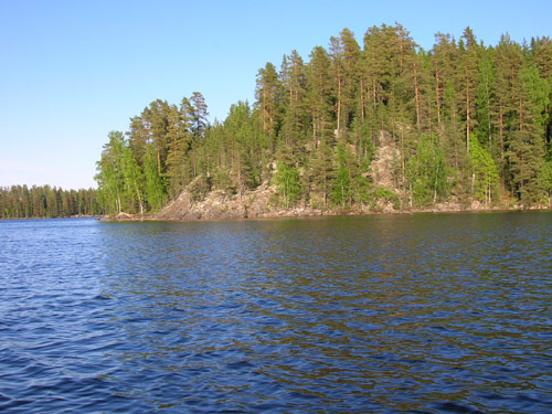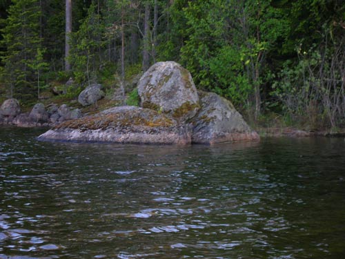 Erikoinen hatun tai pipon muotoinen rantakivi Rautjärvellä. Miellyttävä onkipaikka, äkkisyvä alkaa kiveltä ja kerää ahvenia iltasyönnille. |