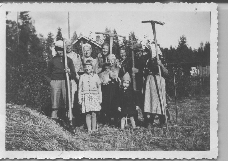 Heinäväkeä Kyrössä 1944. Vasemmalta: Risto Laiho, Eeva Lampinen, Kerttu Ripatti, Aino Kanerva Voikkaalta, Tyyne Åhman, "Virtas-Pappa" Aaretti Virtanen ja Saariska l. Eeva Saarinen. Edessä lapset Raija Åhman, Veikko Åhman ja Raili Laiho sylissään Vili koira.