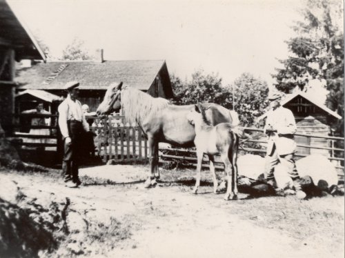 Sipilän pihalla 20-luvulla. Kuvassa vas. Eino Kokkola ja oikealla Einon isä Taavi Kokkola.