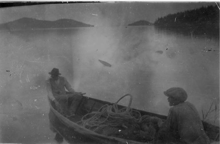 Nuotalle lähdössä Herman ja Tuomas Mattila 1920-luvun alkupuolella. Taustalla vas. ylhäällä Hevossaari ja siitä oikealla pyssysaari. Kuva Liisa Hannonen.