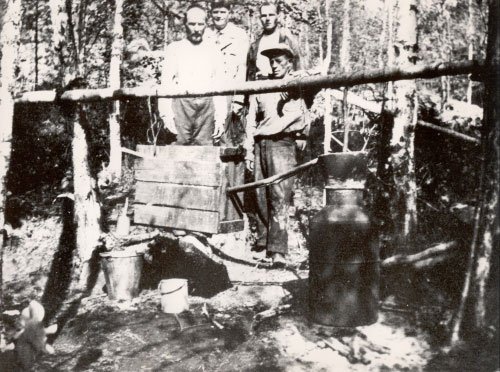 Pontikkalaitteet Lautaniemellä. Edessä tehtailijat Konsta Mynttinen ja Einar Heikkilä, takana pidättäjät Aarne Laiho ja Aleksander Luukkonen.