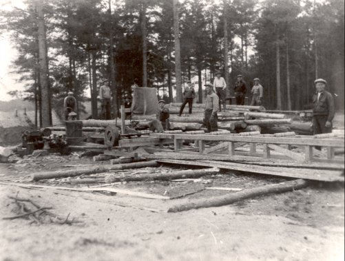 Sirkkelisahurit Huhdasjärven koulun pihalla 1930-luvun lopulla. Toinen vas. "Pitkä Lauri" Lauri Kallio. Sahurina kolmas vasemmalta Viljo Rönkkö.