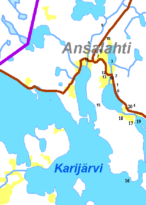 1. Suutarinmäki 2. Mölövuori 3. Markkinajärvi 4. Pukkivuori ja -tarha 5. Myllyoja 6. Kapulasilta 7. Opintöyry 8. Anttilan lato 9. Ansalahden tanssilava 10. Ansalahden kangas 11. Söllin karkia 12. Härkämäki 13. Hiilimiilu 14. Myrkkypytynmäki 15. Talvitie 16. Venäl.pommikoneen putoamispaikka 17. Halttarinmäki 18. Riikanmäki 19. Talaskallio 20. Kololampi